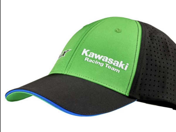 Casquette à visière 6 panneaux aux couleurs du team Kawasaki MXGP, avec panneaux latéraux perforés pour une meilleure ventilation.